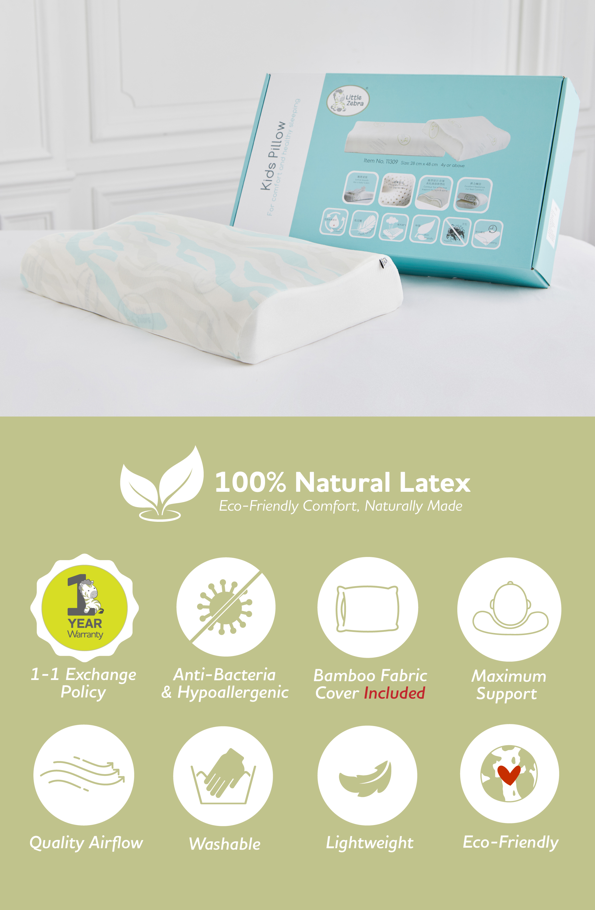 1-year 1-to-1 exchange warranty* Designed for children aged 4-7, this latex pillow provides excellent head and neck support to promote proper alignment and healthy sleep posture. Its breathable, hypoallergenic material ensures cool, comfortable, and restful nights, making it ideal for growing kids.